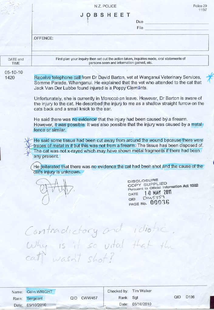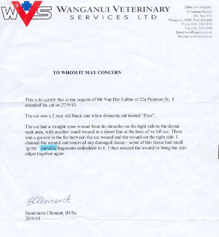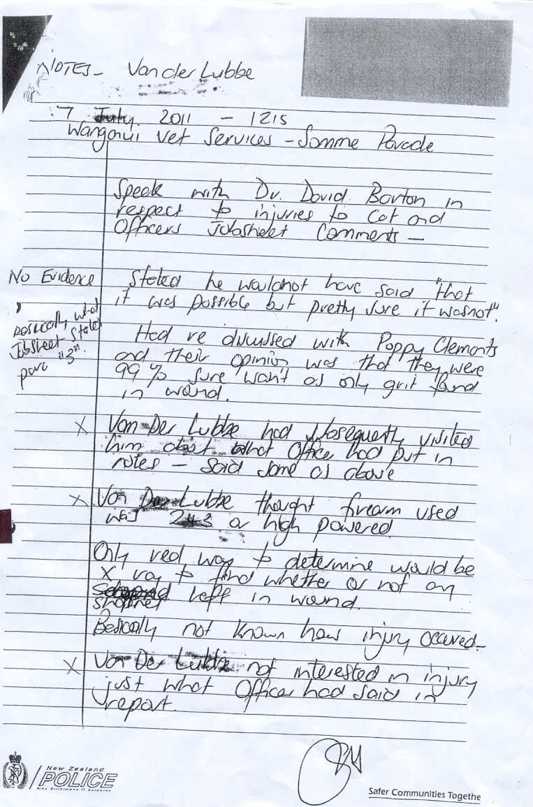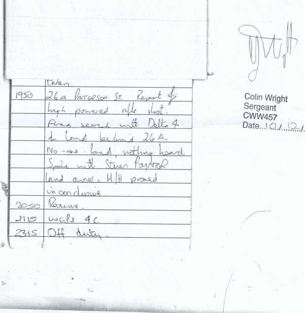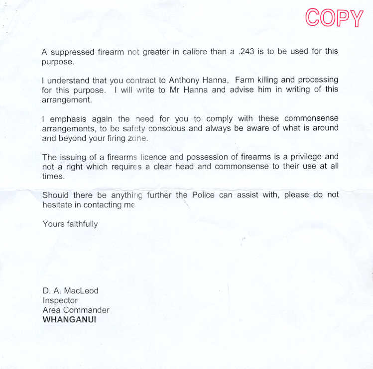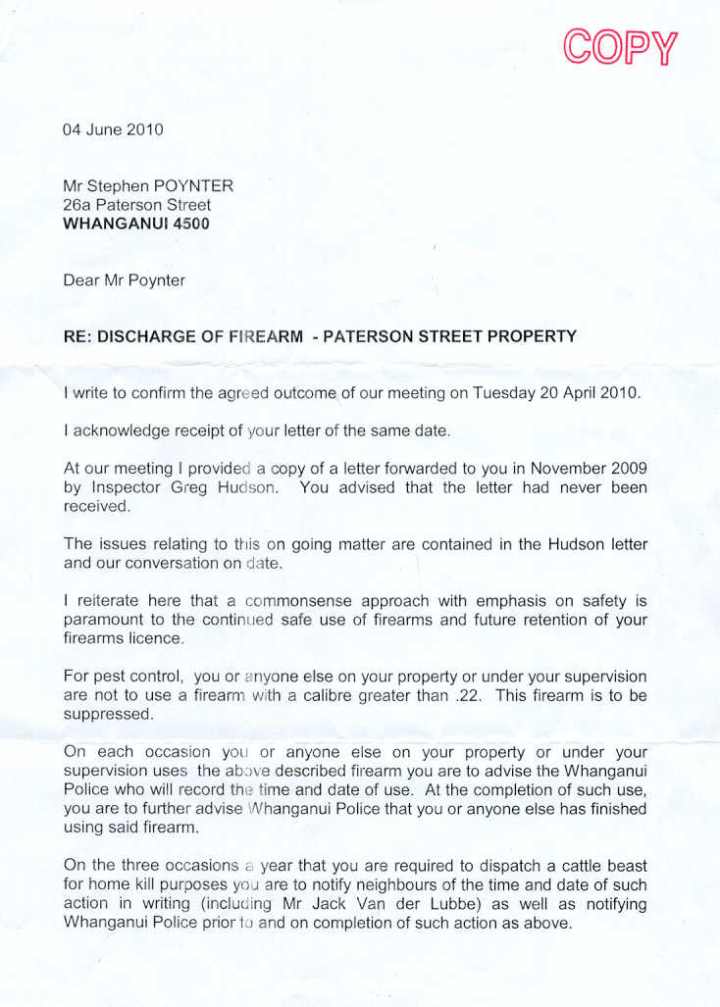 Had Poynter said, sorry, my bad, instead of “Get used to it,” I would not have reported the matter to the Police but as he was unrepentant and returned (with his kids) for another bomb-up the next evening, I contacted the cops. A Constable J Geurtjens of the Whanganui Police spoke to Poynter and warned him not to fire his 243 in a built up area again. Geurtjens Police notes read, “Poynter warned of offence + his actions, warning was accepted.”
