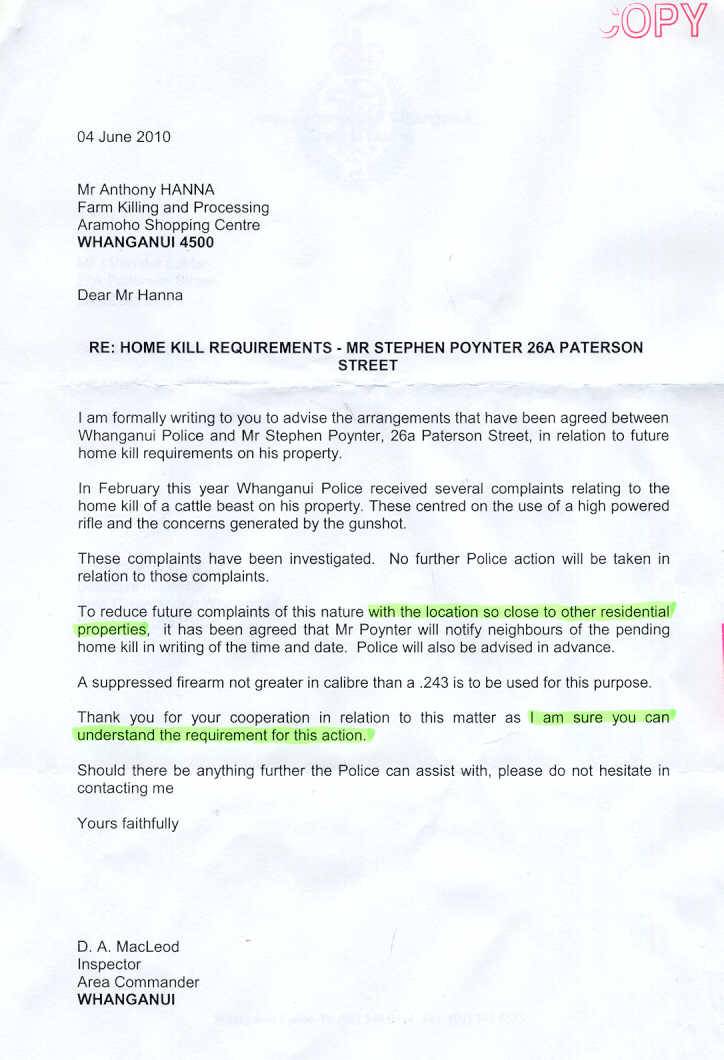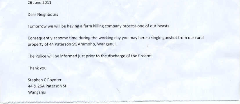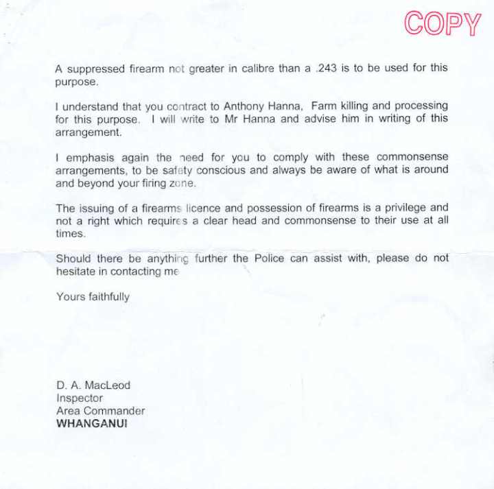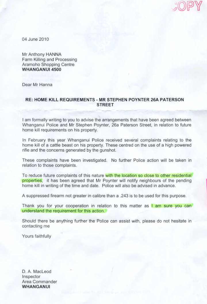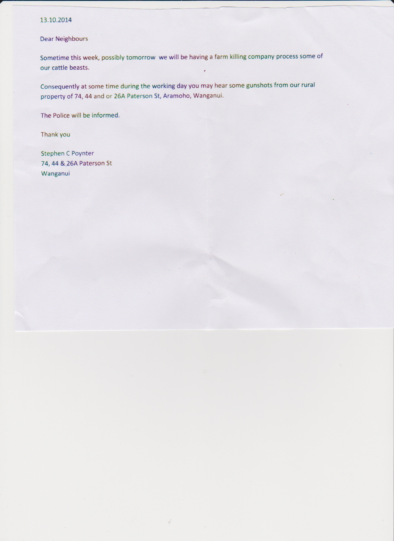 One letter to the District Health Board about the Poynters’ illegally serving homekill beef and pork products to the residents of the Lady Joy Rest Home and the high-powered homekill gunshots are permanently stopped. Who would call the corrupt cops for anything? Not me that’s for certain! Well, maybe to add to the paper trail I might.