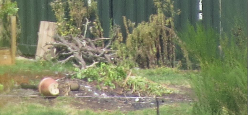 Idiot face, wearing a blue t shirt and looking over fence, is busy boasting about how great a neighbour he used to be to the bloke at number 30 Paterson st while his car (top right) is at number 44 Paterson. The dead deer can be seen by the of the pile of posts and timber.