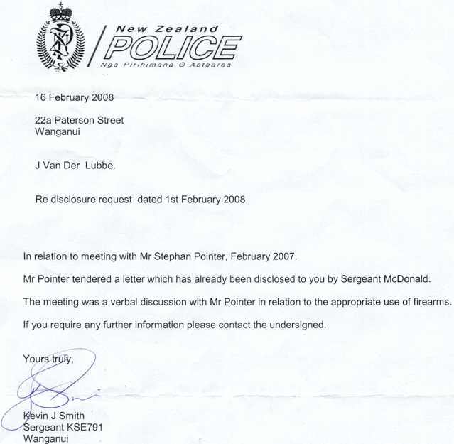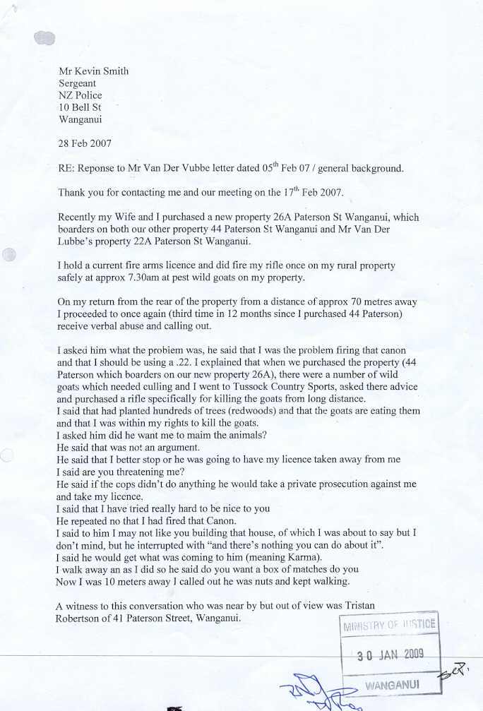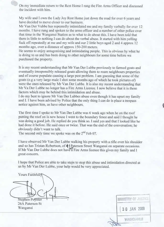The second to last paragraph of Poynter’s letter to Sergeant Smith went like this, “I have observed Mr Van Der Lubbe walking his property with a rifle over his shoulder and so has Tristan Robertson, of 41 Paterson Street Wanganui on separate occasions. If Mr Van Der Lubbe does not have a Firearms Licence this gives my family and I great concern.” (8) (Carefully note that Mrs Poynter hadn’t been drawn into the conspiracy yet and that Poynter addressed his false accusation to the same policeman who told him that I don’t have a firearms licence.