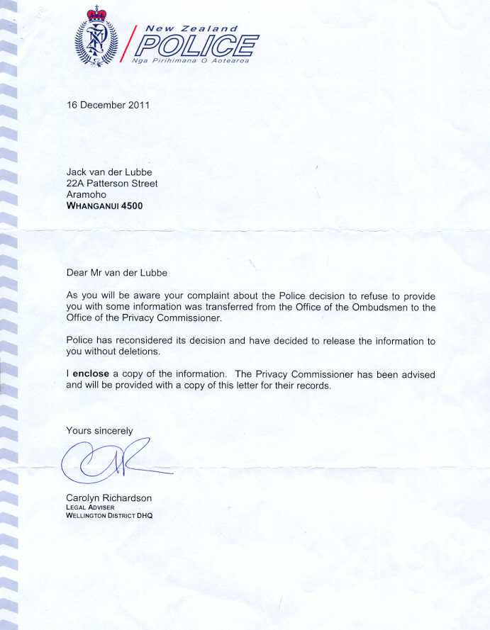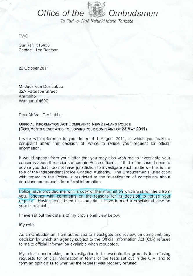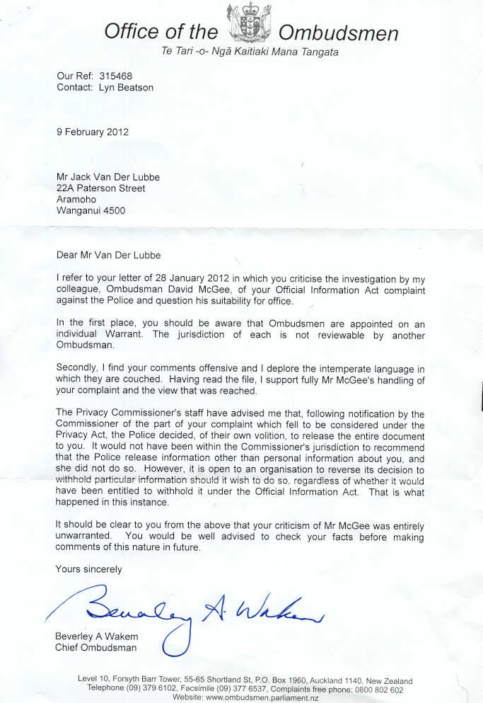 It is quite clear to me that Mr McGee is nothing but a rubber stamp for an obstructive and corrupt police force. It only took one letter to Police National Headquarters from the Privacy Commissioner pointing out the folly of their obstructive stance to reverse the Police’s refusals to supply me with the attached official document and render your Mr McGee’s brownnosing decision null, void, and stupid. I trust you will send the corrupt Mr McGee down the road without a golden handshake.
