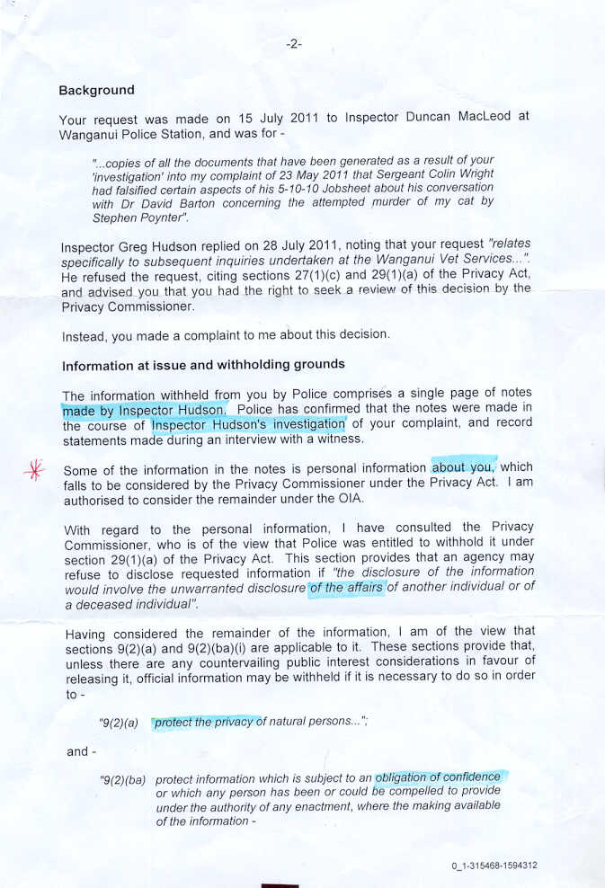 The single page of notes that you have erroneously agreed with the Police that I should be denied relates to a short conversation between Police Inspector Greg (Central Districts fixer) Hudson and veterinarian Dr David Barton. The name of the third person mentioned in the notes is, I believe, veterinarian Genevieve (Poppy) Clement. She is the person who actually operated on my cat (Dr Barton never sighted it) and is the central witness that the Police have carefully avoided interviewing. Shortly after the operation she said to me that the wounds to my cat (metal fragments and all) were probably from a firearm but the Police, without any actual evidence to back up their claim, are adamant that the wounds to my cat “were not from a firearm.” (No bullet wounds, no malicious shooter, simple.)